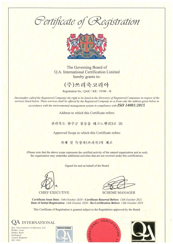 IOS 14001 환경경영인증서 입니다.
