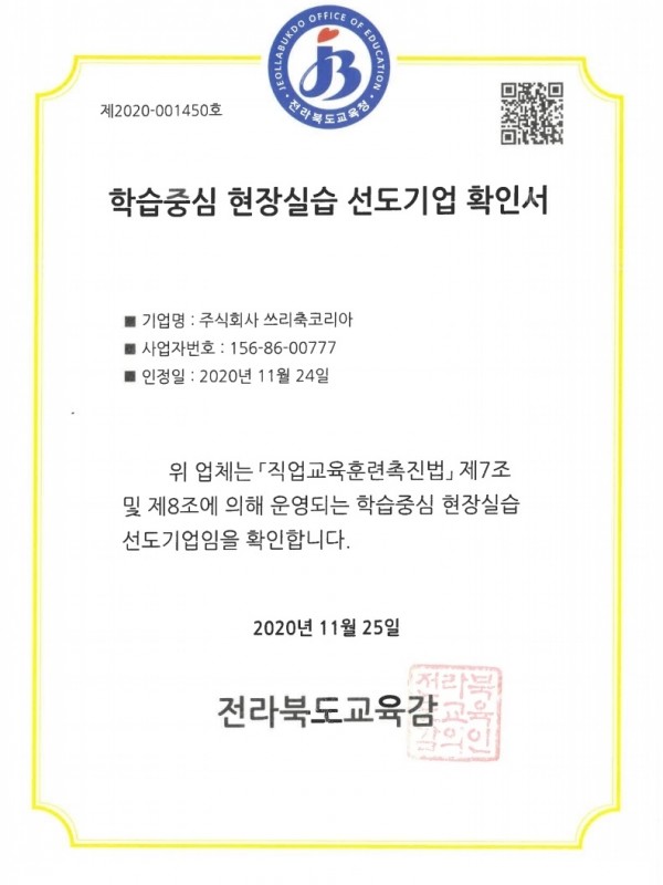 현장실습 선도기업으로 확인 받았습니다.